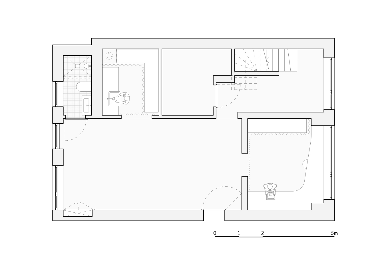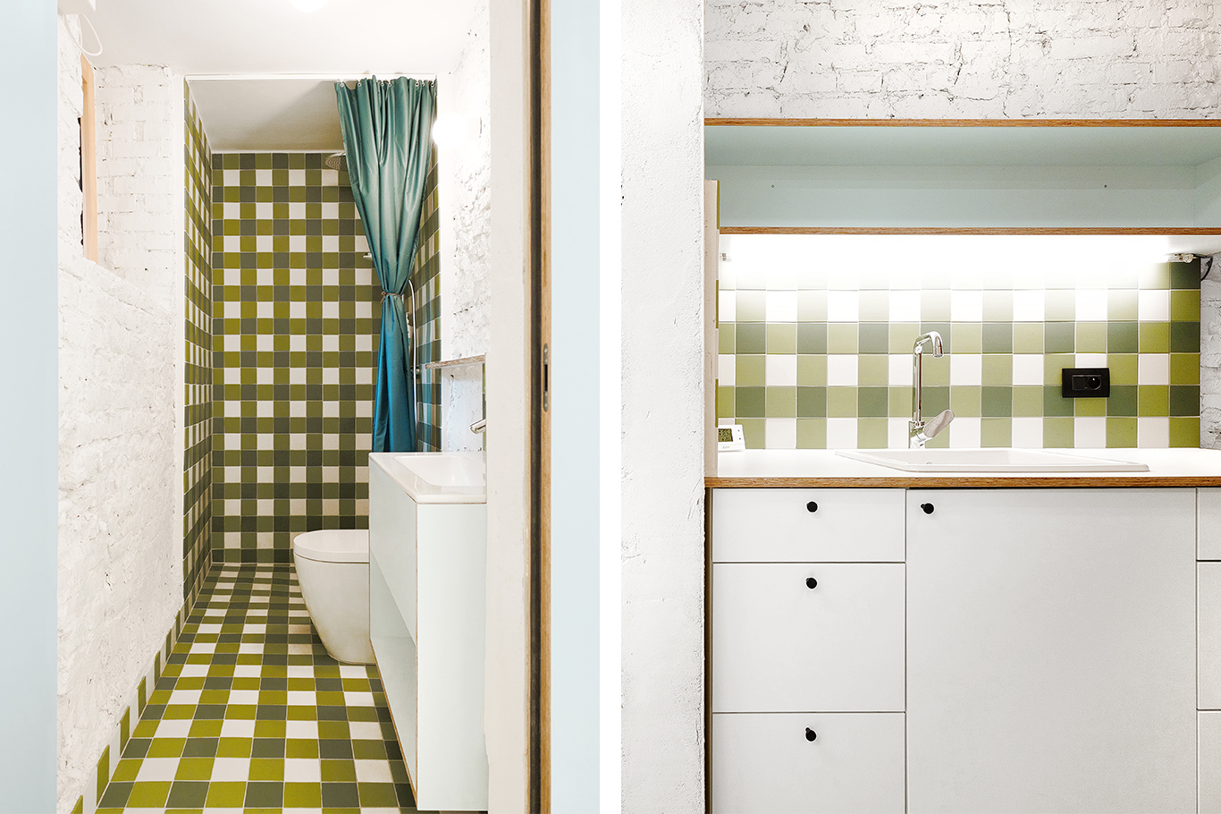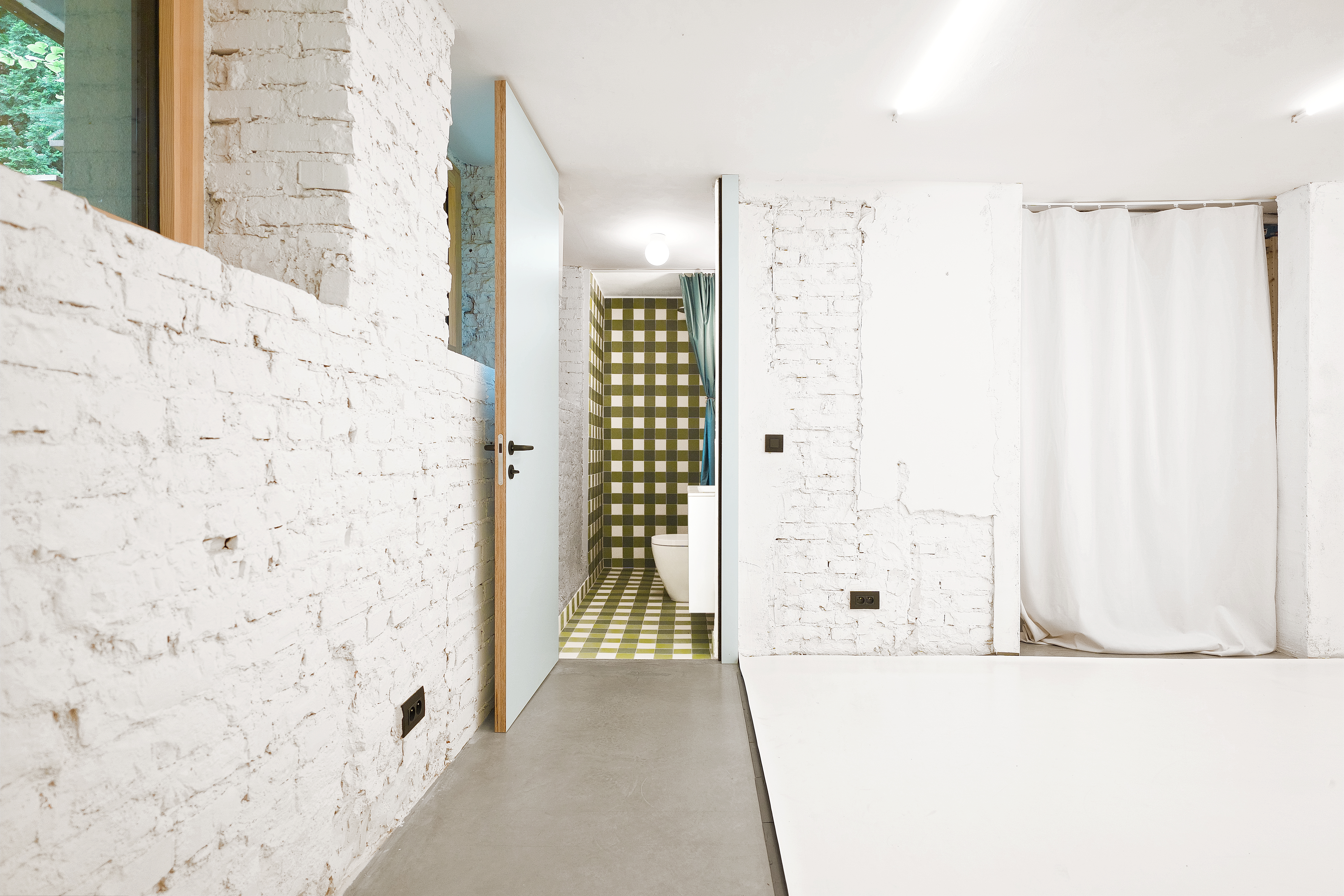 The kitchen and small office are separated by a curtain that organizes the layout without taking away its lightness or sense of openness. The fabric naturally defines the zones while preserving flexibility—the interior can open or close depending on the needs of the classes and their users. The toilet and staircase are integrated into the space in a way that keeps circulation intuitive and the entire layout clear and cohesive.