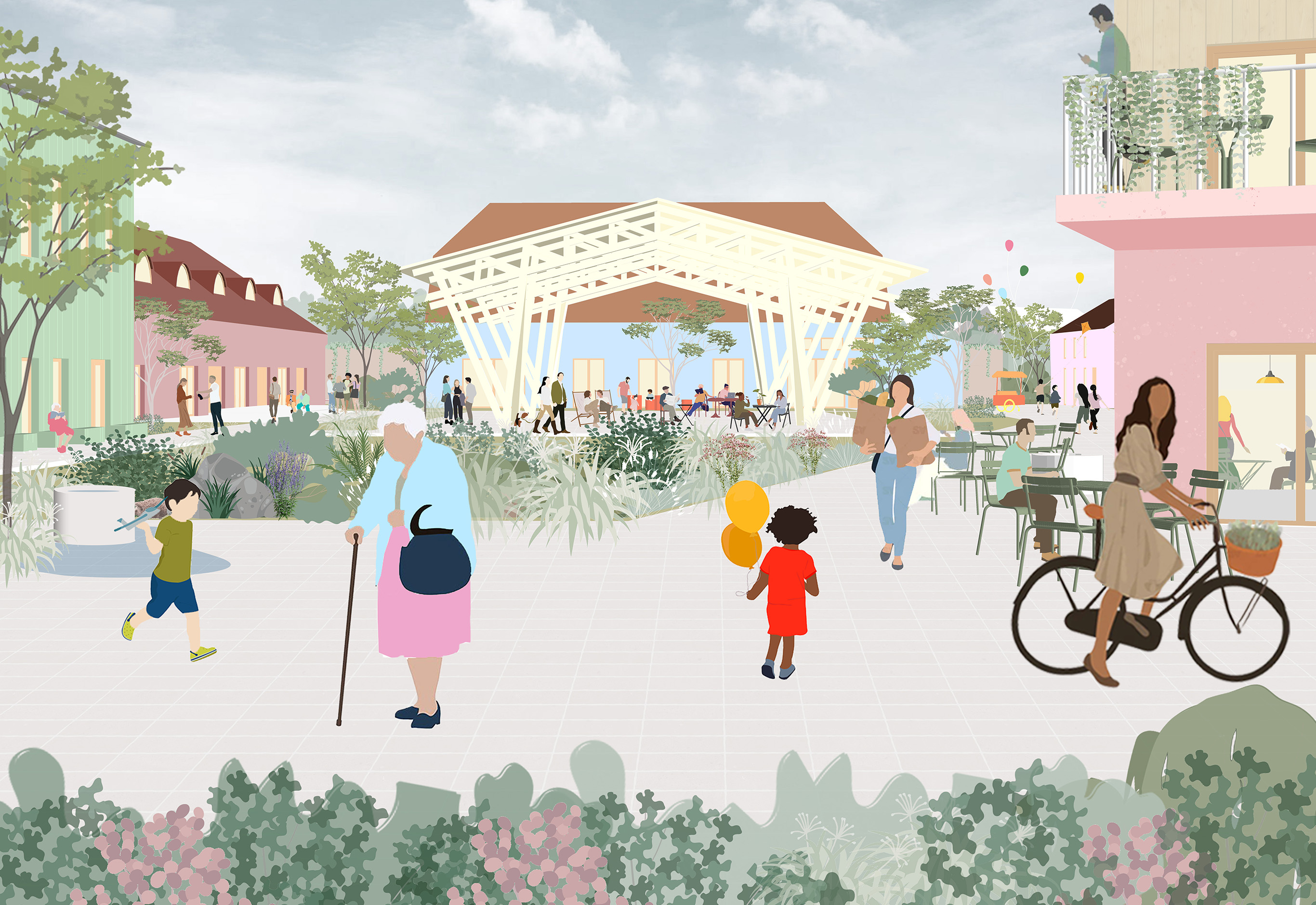 Podejście projektowe kładzie nacisk na adaptacyjność i zrównoważony rozwój. Istniejące konstrukcje są starannie odnawiane z użyciem ekologicznych materiałów, takich jak drewno i bloczki gliniane, przestrzenie poddaszy zostają aktywowane poprzez nowe okna, a układ pozwala na etapową realizację inwestycji. Kościół staje się wielofunkcyjną przestrzenią do warsztatów i wydarzeń, a sąsiednia kawiarnia i obszary coworkingowe sprzyjają interakcjom między mieszkańcami, odwiedzającymi i lokalnymi twórcami.